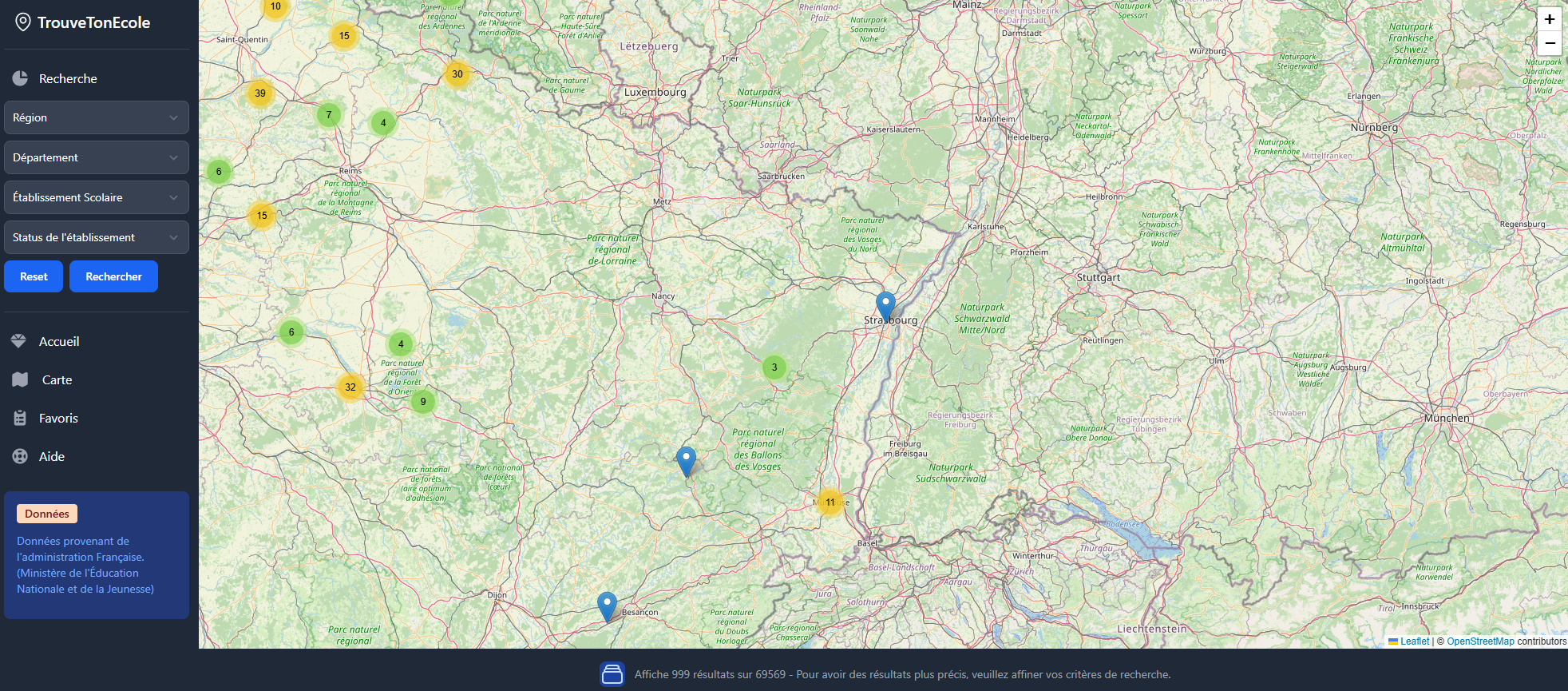 Développé sous React, TrouveTonEcole est une carte géographique interactive affichant les établissements scolaires français à partir d'open data du gouvernement.